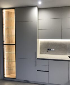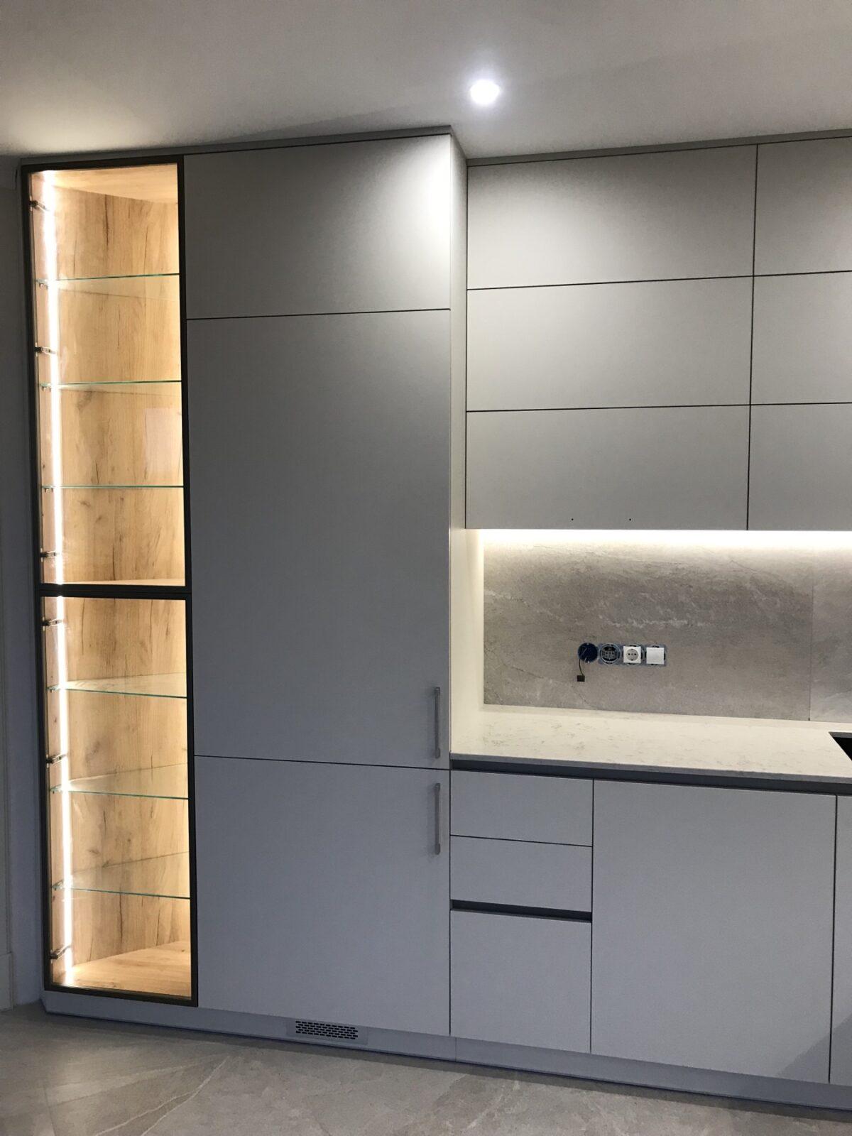 Изюминкой данной кухни является витрина для посуды. Сама витрина выполнена из алюминиевого профиля, внутри ДСП под дерево, а фасады витрины и полочки внутри стеклянные.